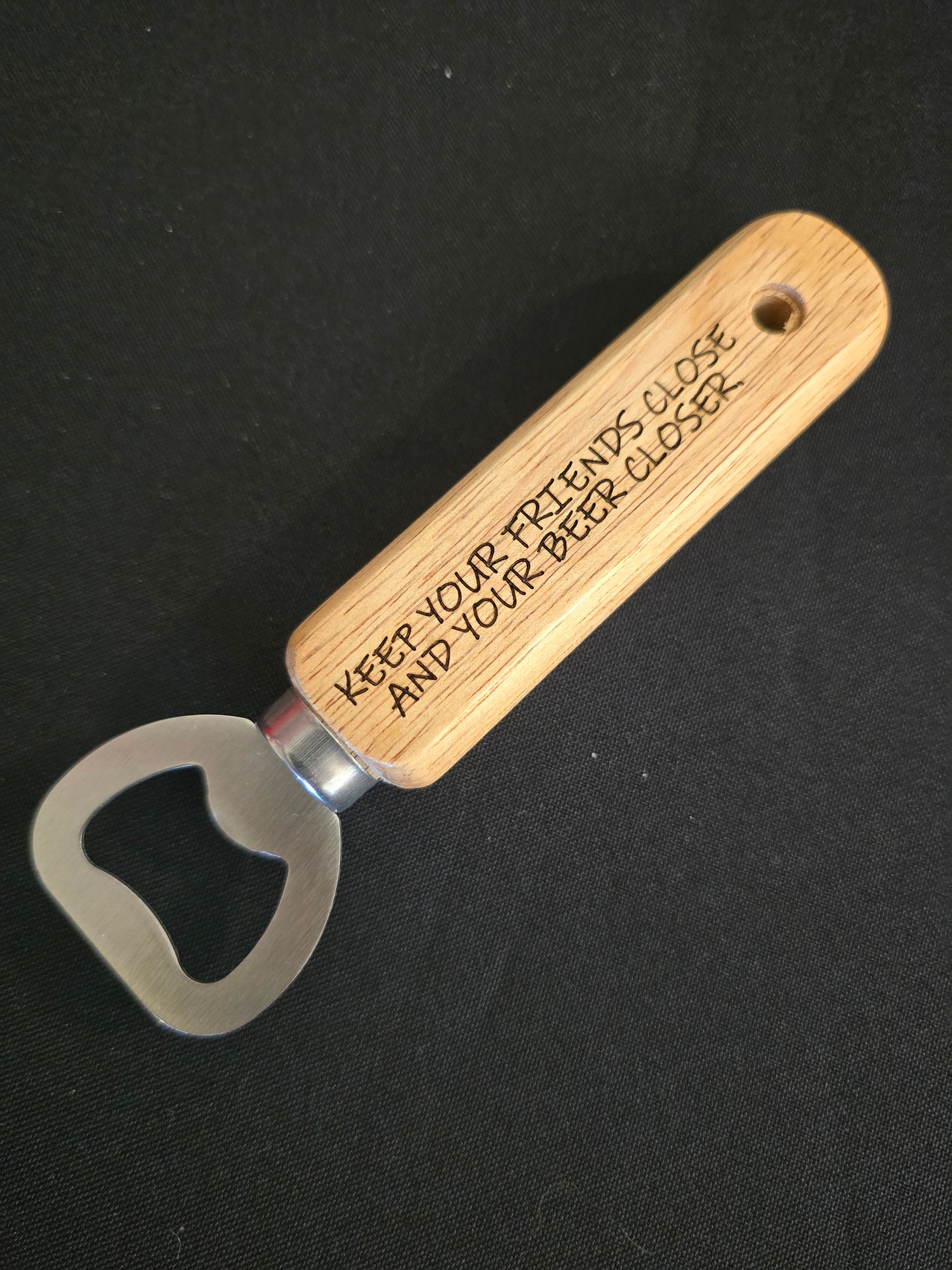 Expertly crafted with laser engraved precision, the wooden handled bottle opener. With various routes and sayings.